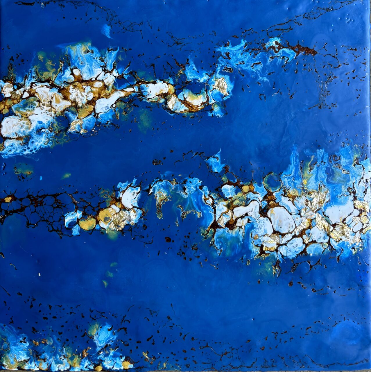 Evolving – Encaustic Mixed Media, 12″ x 12″, $350.00. On 2″ deep cradled board, in a black and gold wood floater frame