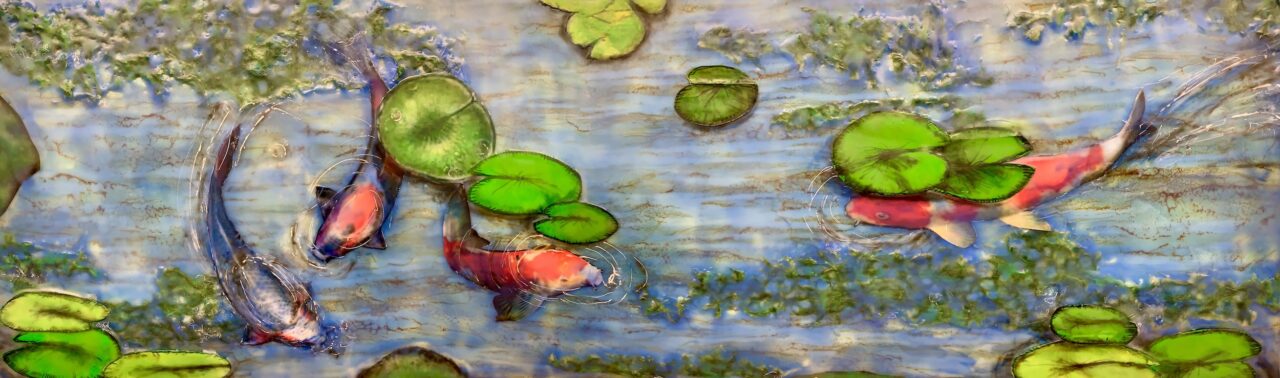 Hoi Polloi of Koi – Encaustic Mixed Media, 10″ x 32″, $800.00. On 2″ deep cradled board, in a black wood floater frame