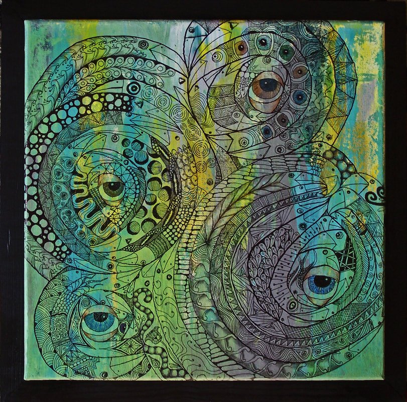 Watching Bird Snakes – 13.5″ x 13.5″ Acrylic on Canvas – Surface framed $250