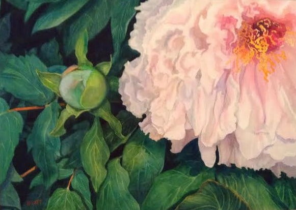 Tree Peony And Bud – Watercolor on 140 lb paper, 28.75″ x 20.5″, framed: $1,200.00