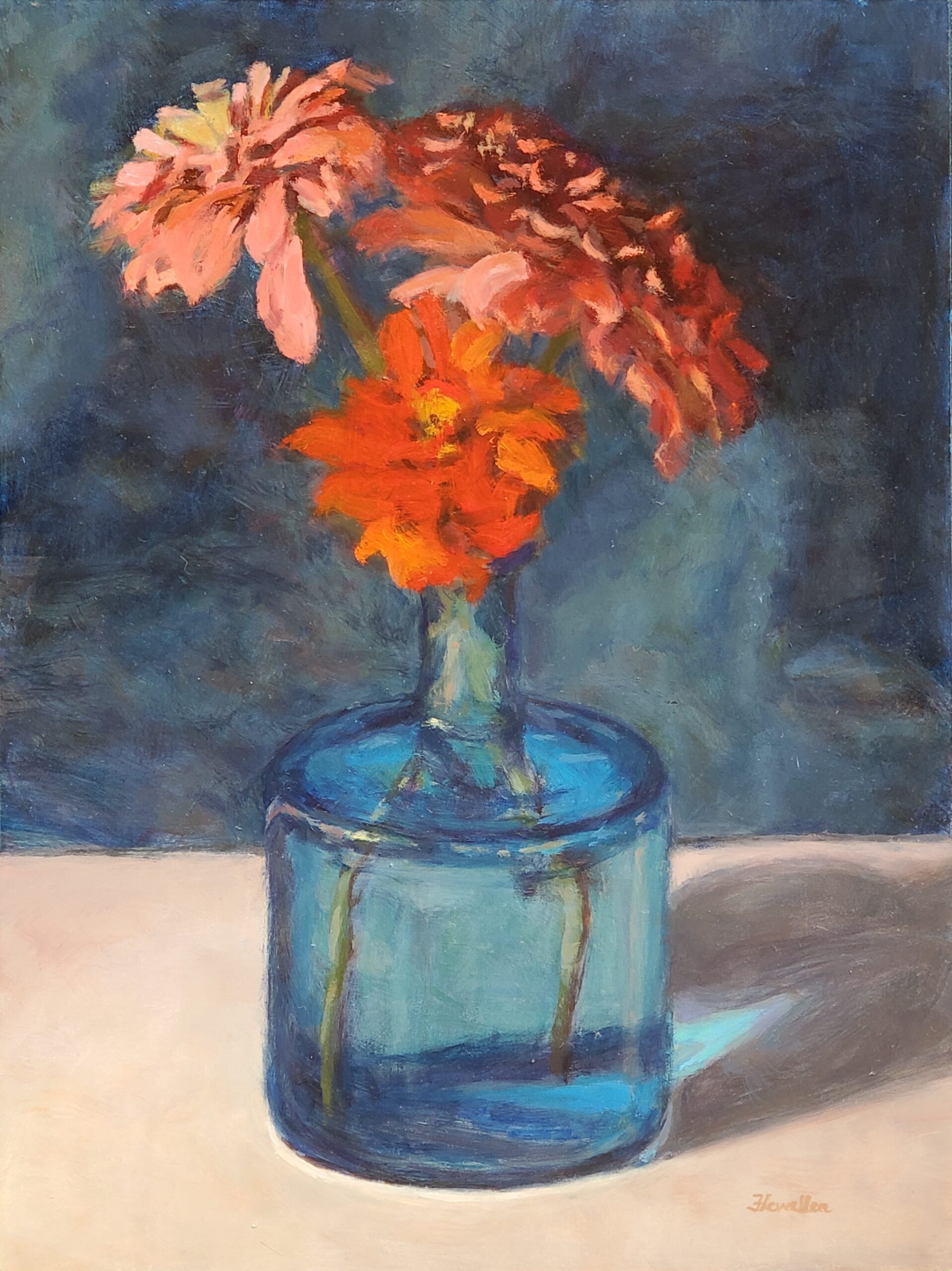 Zinnias Alight – Oil on board, 12″ x 9″, $700